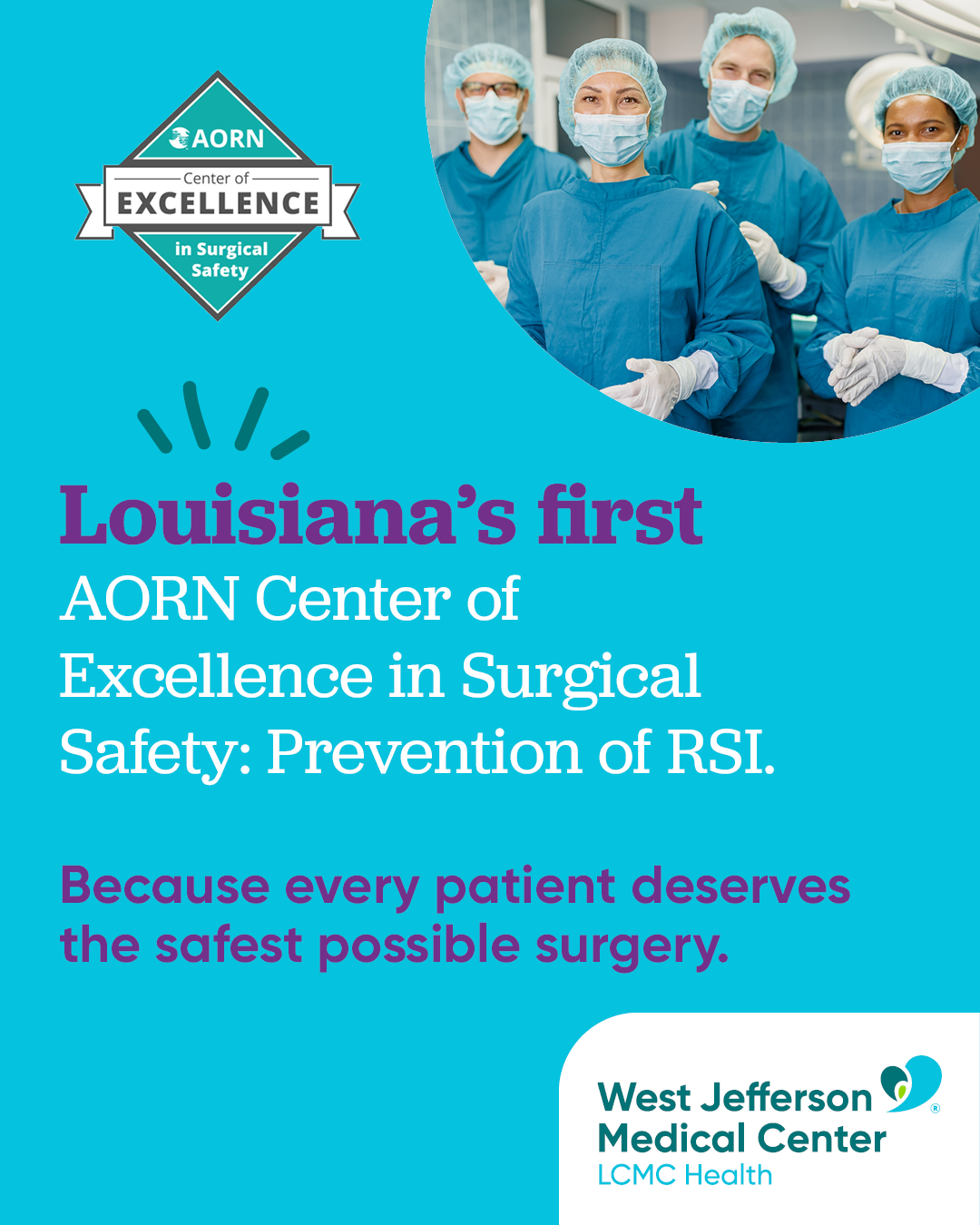 “Being recognized as the first hospital in Louisiana to earn the designation of Center of Excellence in Surgical Safety: Prevention of RSI is a milestone that reflects the commitment and expertise of our entire surgical team, made possible through strong collaboration with our physician partners,” said Garett May, JD, MBA, President and CEO of West Jefferson Medical Center. “Our team pursued a rigorous and unique opportunity, held themselves to the highest standards, and—together with our physician partners—delivered excellence at every step. This recognition is more than an honor; it affirms the culture of safety, innovation, and accountability that defines West Jefferson every day. I could not be prouder of this team and the leadership they continue to demonstrate for our state and our patients.”
