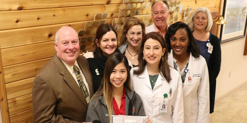 Individuals in picture from left to right: Front row: Robin Ly, Texas Roadhouse Representative; Dr. Nelly Aoun, Oncologist, Cancer Center; Germaine ...